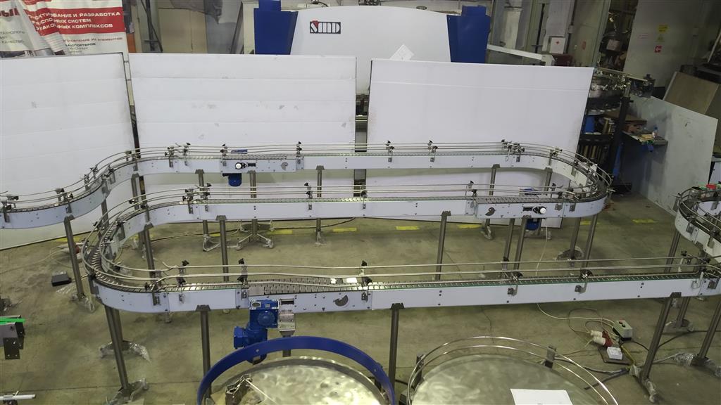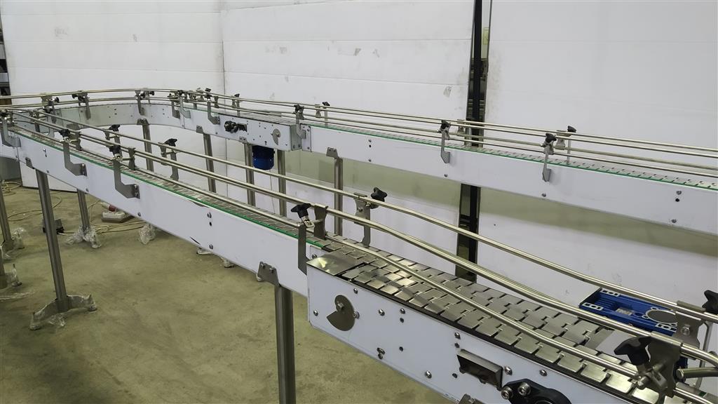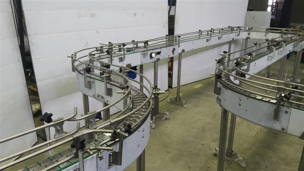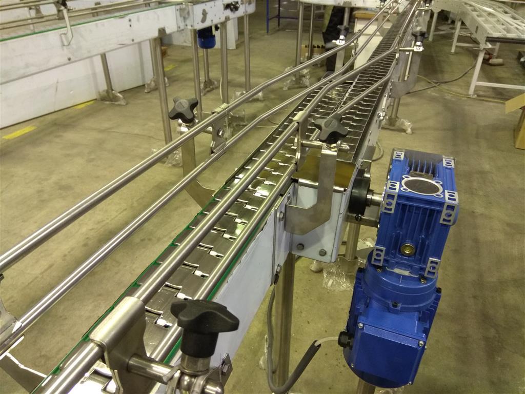 Описание проекта: Для крупного производителя ЛВИ в Казахстане изготовлены пластинчатые конвейеры. Они будут располагаться от участка розлива до участка упаковки.Технические параметры:общая длина конвейеров ~ 17 000 мм, в том числе 8 поворотов на 90°;материал конвейеров - нержавеющая сталь;ширина нержавеющей цепи 82,5 мм;регулируемые кронштейны ограждения из нержавеющей стали с прутком 12 мм;привод 0,75 кВт (NMRW);
