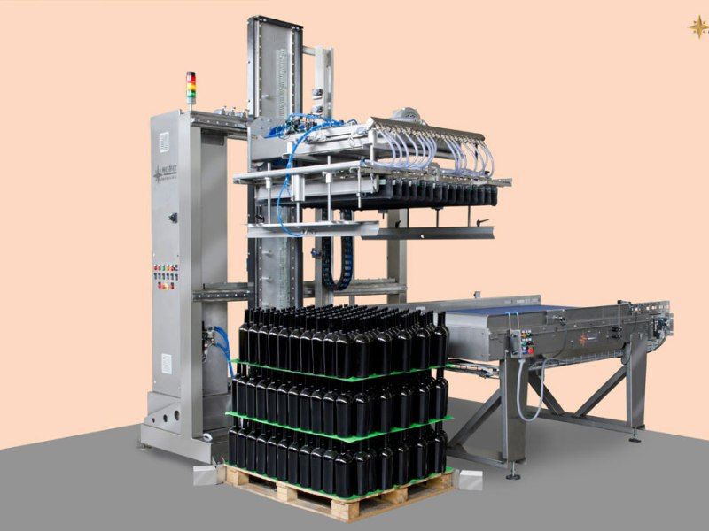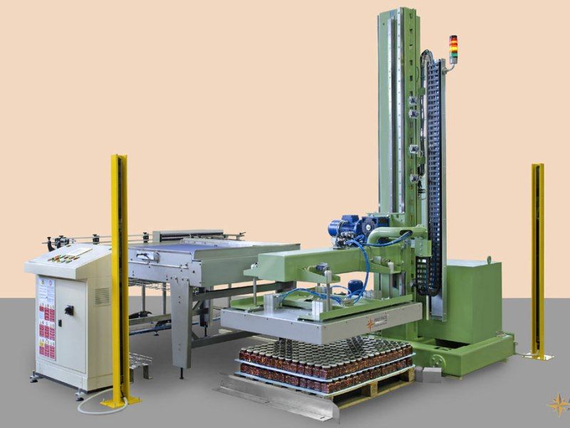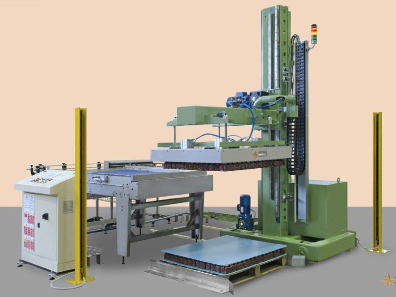 Депаллетайзер состоит из стенок, поддерживающих продукцию, двойной механической системы для вертикального движения поддона и приемного стола.
