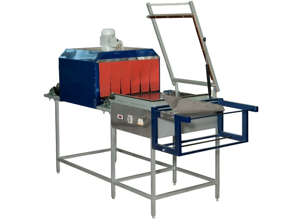 Группа продукции поступает в термоусадочный тоннель, где под воздействием потоков горячего воздуха упаковка усаживается, после чего поступает в зону охлаждения для улучшения усадки.